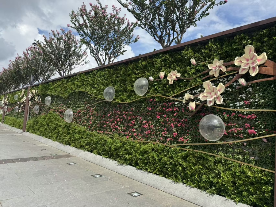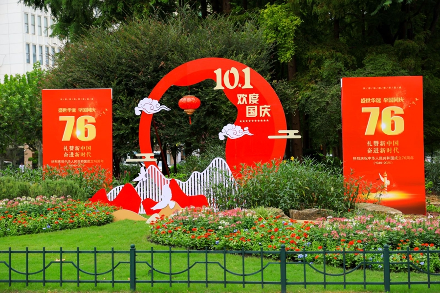 花卉布置有立体花坛、街边花境、主题景点、组合容器、灯杆花球等多种形式,色彩搭配以国庆特有的红黄色调为主,并融入粉、紫、橙等辅助色,以及国庆主题标识等设计内容,营造温暖热烈、和谐明快的城市景观。